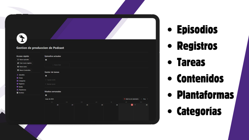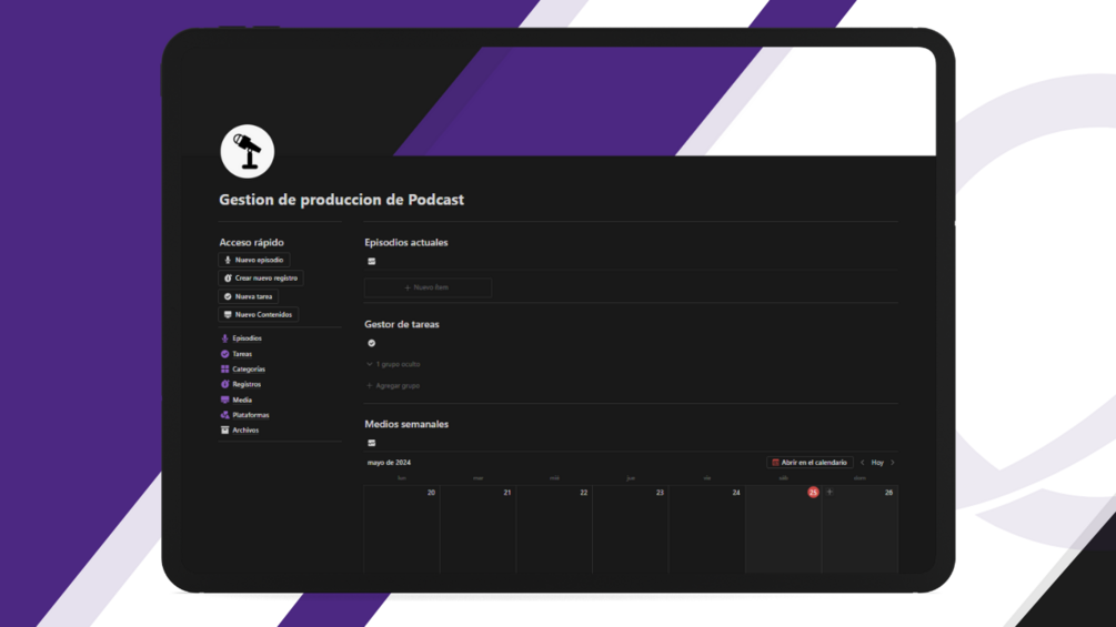 ¡Hazte con la plantilla "Gestión de Producción de Podcast" de Notion y lleva tu podcast al siguiente nivel! No dejes que la desorganización te impida alcanzar el éxito. Con esta herramienta, tendrás todo lo que necesitas para gestionar tu producción de manera integral y efectiva. ¡Empieza ahora y transforma tu manera de producir contenido!